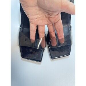 This sophisticated slip-on mule style heel sandal by designer Black Suede Studio is crafted in Brazil with a clear PVC front strap andleather insole. Beautiful unique square toe and a slim silhouette heel. Size 40, which fits a US size 9. These shoes are brand new without tags are box, but there is some surface scratches from not being in box and from sticker residue. Small flaws are shown in last three pictures. Comes from a smoke-free home. Retail cost $348