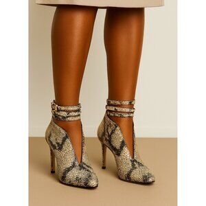 The Black Suede Studio Snake Print Pointed Toe Sandal Heels in size 8 are stylish and versatile for both party and business occasions. Made with leather lining, suede upper, and leather outsole, these heels feature a pointed toe design with a buckle closure. The black color and snake print theme give these pumps a trendy and sophisticated look, perfect for summer and spring seasons. With a medium shoe width and comfortable leather insole, these heels from the black suede studio are a must-have in any woman's wardrobe.