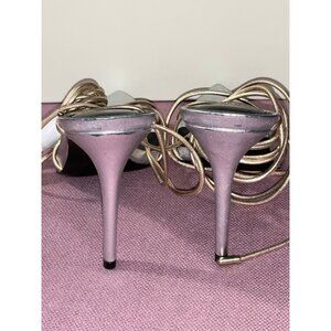 Tubular straps climb up the vamp and wrap around the ankle of a metallic leather sandal framed by a pointy toe and stiletto heel.