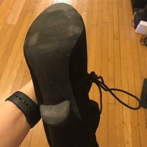 Women’s 7 1/2 Black Thigh High Suede boots. Worn max 10 times. Just didn’t get as much use out of them as I thought I would. They tie at the top around your thigh to stay up & the also have a zipper on the inner side of each boot. Very cute and stylish, just didn’t get to wear them as much as I would have liked.