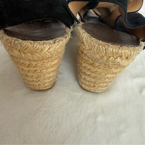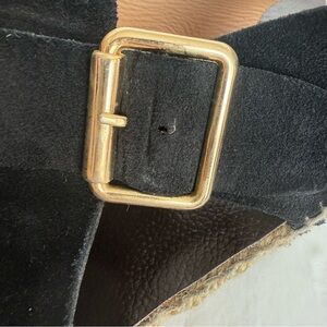 Step out in style with these chic black suede wedge sandals. Perfect for any occasion, they offer comfort and elegance. Features gold buckle closures.