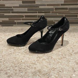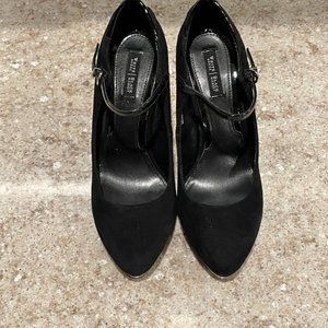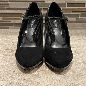 Elevate your style with these black suede women's heels from White House, Black Market. With an almond toe shape and stiletto heel style, these pumps are perfect for any occasion from wedding to workwear. The buckle closure and adjustable strap make them easy to wear, while the half inch platform and ultra high heel (4 in & higher) add a touch of glamour.