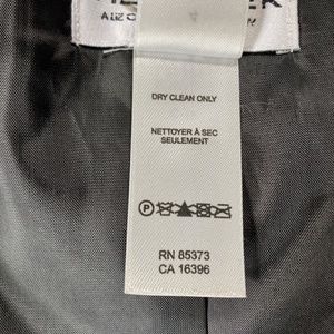 Three button front with pockets that are still sewn shut. This was worn 2 or 3 time with no real signs of use. 100% polyester material and lining so it will keep its deep color for its lifetime. Lightly padded shoulders and subtle preplum shaping.