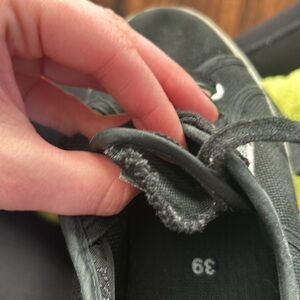 S on back of right shoe has rubbed off. Small rip on tongue of right shoe but not noticeable when wearing, and could be fixed easily.