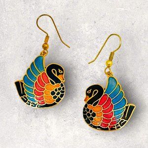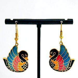 Black swan enameled earrings on fish hook wires. Size is approximately 1-1/8" x 1". The length from the top of the wire is approx. 1.75". Very good overall condition. A few small marks on the back but the front enamel is very good.