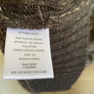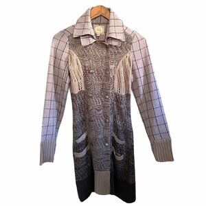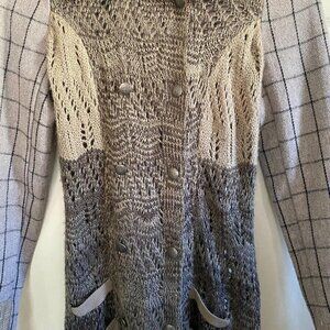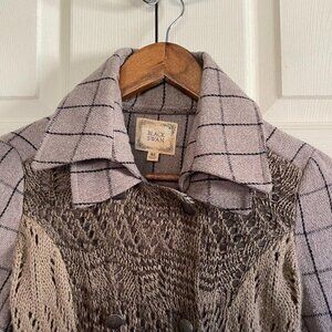 Black Swan Women's Open Knit Plaid Crochet Wool Blend Long Line Double Breasted Pockets Cardigan Sz XS. Measurements Shoulder to shoulder: 14" Underarm to underarm: 17" Length: 34" Sleeve: 25" Offers always welcome! Measurements are approximations taken while hanging