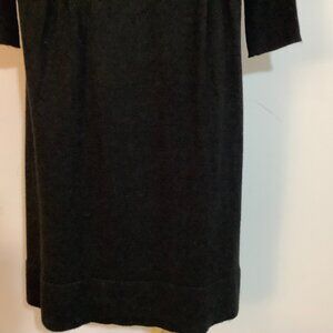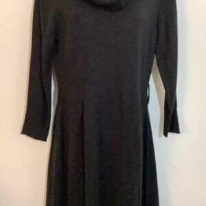 Dress is in good condition. Cowl Neck, Fitted bodice, skirt flares with small pleats front and back coming out from the waist. Belt loops however, belt is not included. Slip On. Measures about 17" across back from underarm seam, about 14" from center back neck to waist. About 22" from waist to bottom of skirt. Classy and comfortable. Striking with jewelry. Acrylic for easy care. See photos for details.
