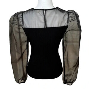Fitted Black Sweater Top with Sheer Taffeta Balloon Long Sleeves that hold their shape, elastic cuffs, and back button closure, Size S in excellent like new condition - worn once to a Christmas party - perfect for a holiday or NYE outfit! Such a cool, stylish top - can dress up with a skirt or down with jeans.