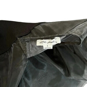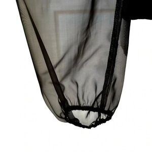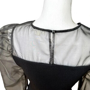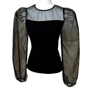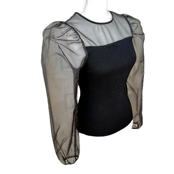 Fitted Black Sweater Top with Sheer Taffeta Balloon Long Sleeves that hold their shape, elastic cuffs, and back button closure, Size S in excellent like new condition - worn once to a Christmas party - perfect for a holiday or NYE outfit! Such a cool, stylish top - can dress up with a skirt or down with jeans.