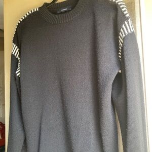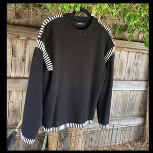DOKOTOO, Black sweater with black and white striped cuffs and hem, featuring a relaxed fit and soft material in a genearous size Small. Measurements 20 inches pit to pit and 24 inches in length #stripedsweater