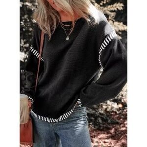 black sweater, striped cuffs, relaxed fit, soft material, oversized style, casual knit, monochrome, cozy, streetwear, versatile