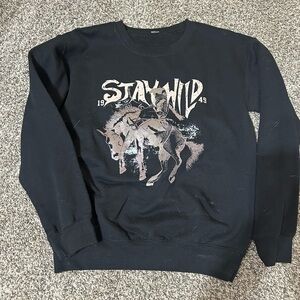 This black sweatshirt features a striking graphic print of stylized horses in motion, complemented by the text 'STAY WILD' in a jagged font. Designed with a comfortable crew neck and long sleeves, it is perfect for casual wear. The ethereal design adds a unique touch to your wardrobe.