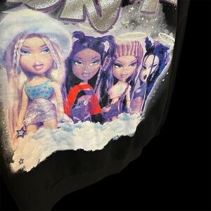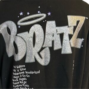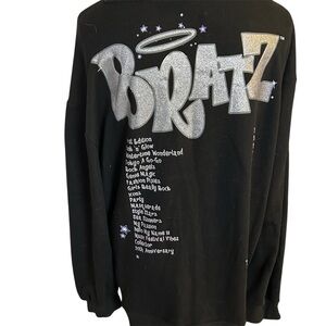Trendy black sweatshirt featuring a bold silver Bratz graphic. Ideal for casual outings.