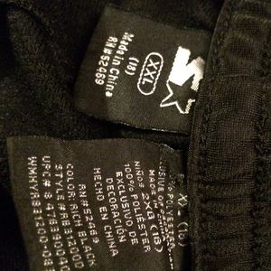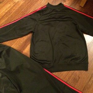 This sweatsuit / warm up is perfect for being active and keeping warm. Black full length pants and long-sleeved jacket. 100%polyester. Black with red stripes