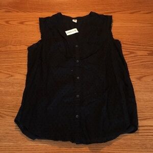 This black tank top blouse has little Swiss dots all over it. The arms have ruffles around them. The shirt buttons up, with a ruffled hole on the front too.