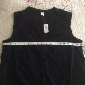 This black tank top blouse has little Swiss dots all over it. The arms have ruffles around them. The shirt buttons up, with a ruffled hole on the front too.