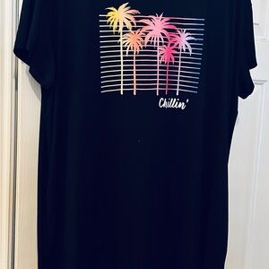 Black t-shirt dress pockets featuring a colorful palm tree graphic. Perfect for casual wear.