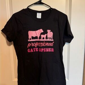 Black t-shirt featuring a pink cow design and 'Professional Gate Opener' text. Casual and fun style.
