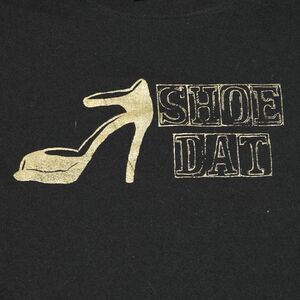 Classic black t-shirt with a bold gold metallic "SHOE DAT" design. Ideal for everyday style. Perfect for any shoe fanatic or NFL Saints fan.