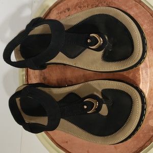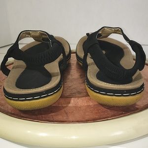 Very cute and well made black and tan sandals. The top soles are memory foam for great support. Cute gold tone accent with elastic sling back.