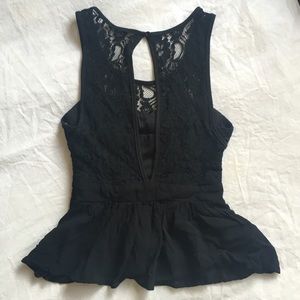 Black tank top with ruffle peplum by Kiwi Tucker. Used but in good condition. Includes side zipper. Measures 25" all around the under bust, and measures 21 1/2" in length.