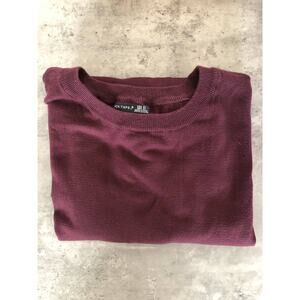 Get cozy in this drop shoulder sweater. It comes in the color wine, which is a deep purple shade. The lightweight knit make this perfect for layering or throwing under a vest. The bottom hem line is accented with a curved and ribbed bottom. The neckline and cuff are accented with a ribbed design. It is a pullover style with a crew neck.