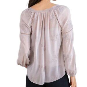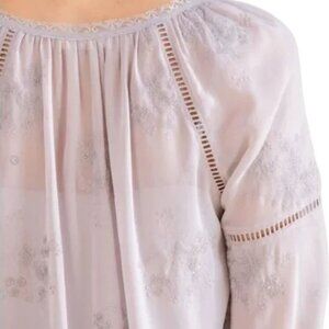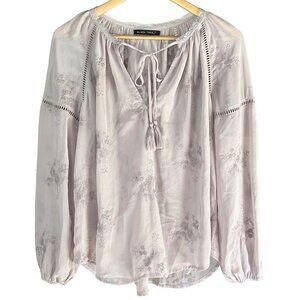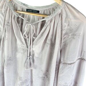 Black Tape embroidered boho peasant blouse in a dreamy blend of lilaca/lavender/mauve. Semi-sheer flowy fabric with beautiful floral embroidery, long sleeves, and tie-front tassel detail. Size small with an oversized fit—also works for medium. MSRP $70, new with tags.