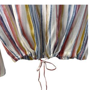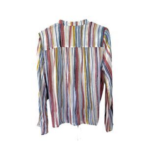 This very pretty long sleeved 100% viscose top is super lightweight and breathable and perfect for this time of year. Colorful with rainbow stripes and can be worn with pants ,shorts and skirts. Has a tie waist that gathers at the hem, and hidden buttons for a clean look.
