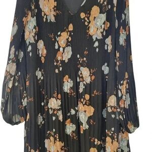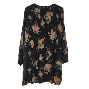 Black Tape Women's Pleated Black Poly Chiffon V-Neck Long Sleeve Relaxed Fit Lined Dress EUC sz L