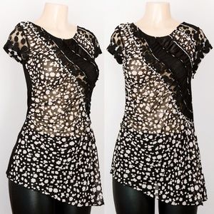 The beauty is in the detail and variety of texture for this mixed media top. Where do we start? The feminine lace sleeves? The ruched and draped spotty chiffon?