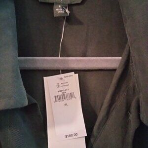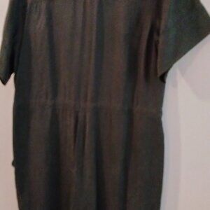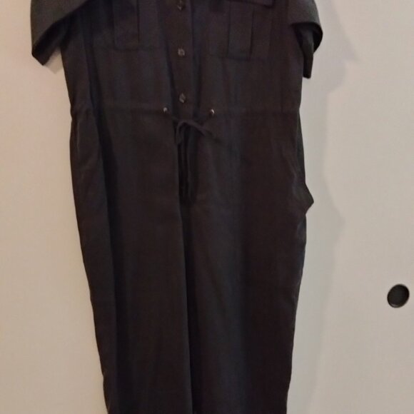 Black Tencel jumpsuit, size Large, short sleeve, button all the way up the front with cinch closure at neck. Beautiful drape fabric, multiple seasons, chest 44", inseam 28". Brand new, tags on. Banana Republic. Full straight leg style, not tapered. Waist can be adjusted with sewn in pull cords. Waist 42" without being pulled in for fitting. 2 working chest pockets.