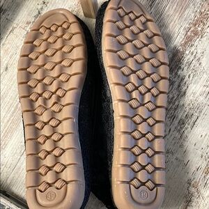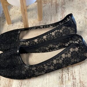 These black flats feature a textured lace upper with a rounded toe design, offering a blend of style and comfort. The slip-on style and flexible sole make them perfect for everyday wear, while the low-profile silhouette adds a touch of elegance.
