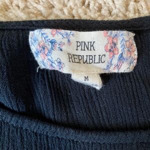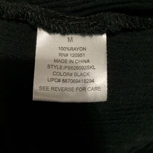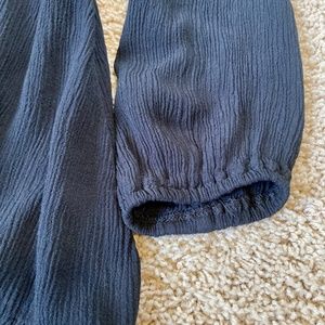 Black wide neck top with a flowy, draped shape. Elastic gathered sleeves and a tie across the back of the neckline to hold the scooped shape in front and back on your shoulders.