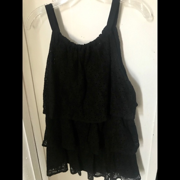 Black Textured Three Tiered Ruffled Top with Gathered Neck Tie