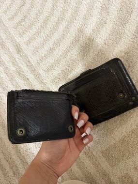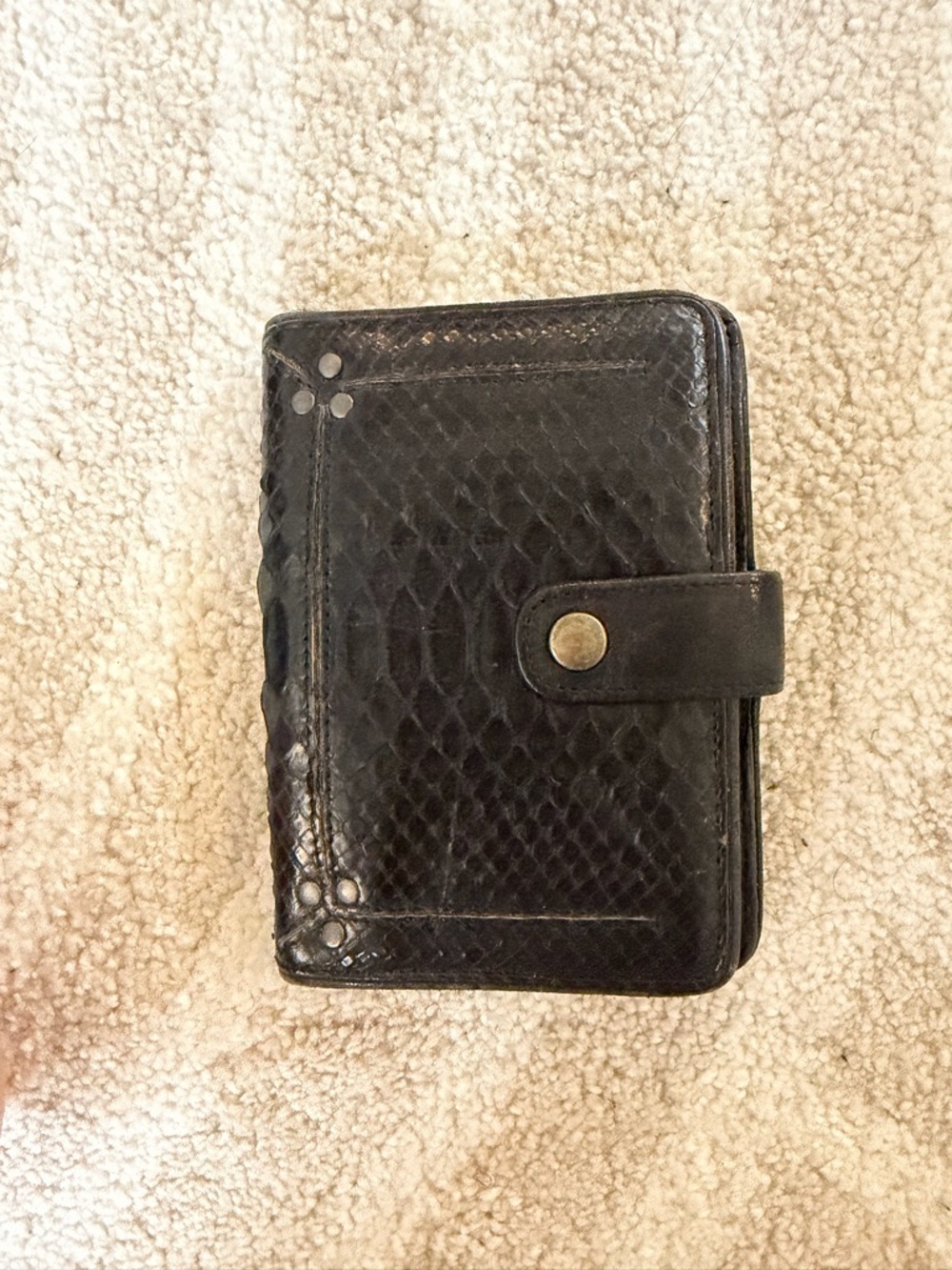Compact dark brown wallet with textured, snake-like embossed exterior. Snap closure with brass-tone button. Multiple stitched card slots and tri-stud corner detailing. Sleek and versatile accessory.
