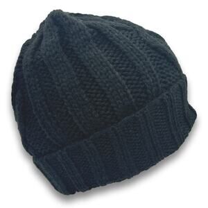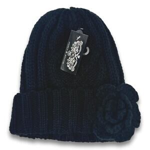 Black Thick Warm Knit Beanie Long Cuffed With Flower Accent Fall Winter Snow Hat