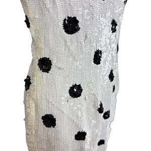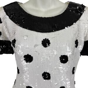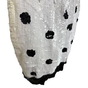 This Black Tie Oleg Cassini Vintage dress is a stunning formal piece made from 100% silk, featuring allover sequin dots for a touch of glamour. The white dress in size 10 has a high neck, short sleeves, and a zip closure at the back. Perfect for weddings, parties, or other formal occasions, this vintage dress exudes elegance and sophistication. The sheath style and lined interior make it a timeless addition to any wardrobe, ideal for summer, fall, or spring events. Designed by the renowned brand Oleg Cassini, this dress is a true statement piece that requires dry cleaning to maintain its impeccable quality.