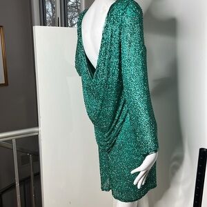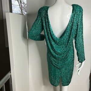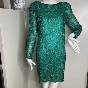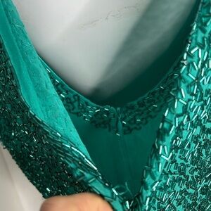 This is a stunning Black Tie Sz 6 Green Fully Beaded Silk Cocktail Dress with Scoop Cowl Back. The original price tag is still attached. Some of the beads are missing just from storage, but can be replaced if needed from a bead shop. Not noticeable if at all. Double shoulder pads, can be removed if you choose. Interior built in slip with back zipper. No odors. No tears.