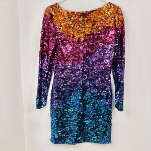 Dazzling and unforgettable, this Black Tie by Oleg Cassini dress is a show-stopper for any special occasion! Covered entirely in shimmering sequins, it features a stunning ombré gradient that transitions from vibrant orange and pink through purple to aqua blue and teal. The stretch polyester fabric hugs the body for a flattering silhouette, and the long sleeves add a touch of elegance. Condition: Excellent pre-owned condition