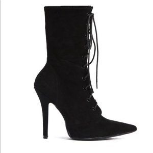 Stylish Tied Bootie in Black! The heel is 4.0 - 4.5 inches. These boots are super trendy and are sure to spice up any ensemble! Great for day or night wear!