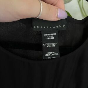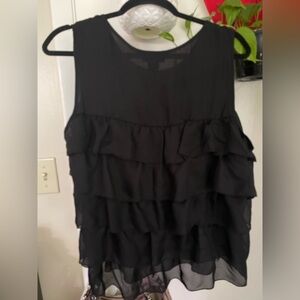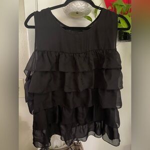 This chic black blouse from Apostrophe showcases a sleeveless design with elegant ruffled tiers, offering a sophisticated and stylish look. The flowing fabric enhances the ruffled details, making it a perfect choice for both casual and formal occasions.