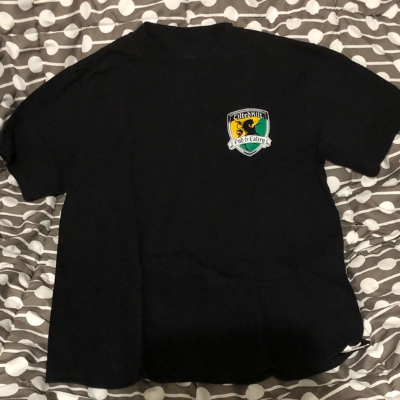 Black t-shirt featuring Tilted Kilt Celtic patch on the chest. Perfect for casual wear. NWOT