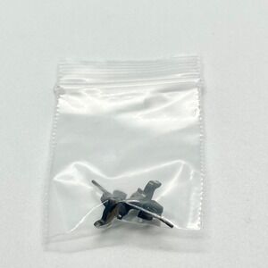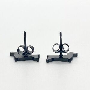 A pair of black dachshund stud earrings. Made of black plated stainless steel. Butterfly backings. Measures approx. .5" in length and .25" in height; shown next to a penny to help indicate size.