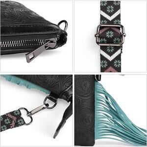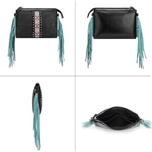 Black Tooled Faux Leather Turquoise Fringe Tassel Studded Aztec Boho Western Bag