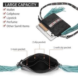 Black Tooled Faux Leather Turquoise Fringe Tassel Studded Aztec Boho Western Mini Bag