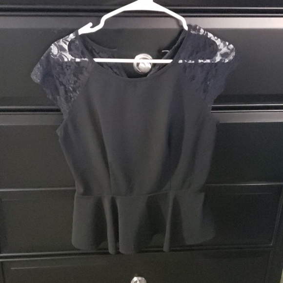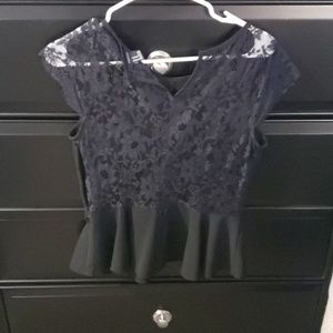 Peplum top with lace sleeves and open lace back. Missing button in the back