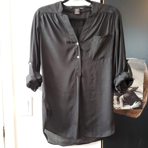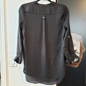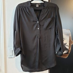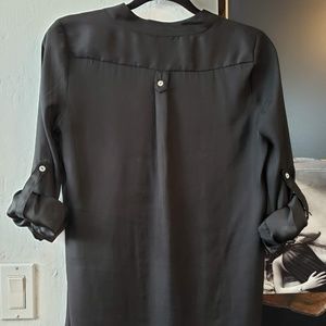 This top is satin soft and great to throw on over shorts or to wear with jeans. Can also wear over a bathing suit as a cover up! Its loose fit keeps you feeling cool and comfortable. 3/4 sleeve length that you can roll up to a 1/2 sleeve and secure with a button. Size small. New condition.