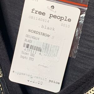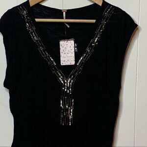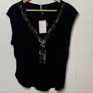 Black Top Free People Cap Sleeve Deep V Embellished Tee NWT Size Small Maya