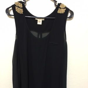 This black top is a perfect addition to any wardrobe right in time for spring & summer. This top -- BLACK with a SHEER back--LONGER in the BACK and JUST the RIGHT LENGTH in the front--SHOULDERS are EMBELLISHED with black and gold--LOOSE FIT, and is slightly worn. ⚡️Fast shipper || depending on when item it ordered, shipped same day or next morning.