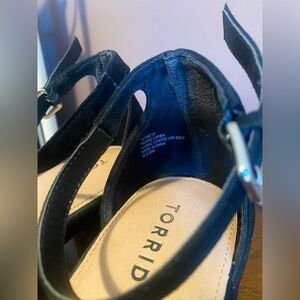 Black 2 inch open toe block heels with adjustable ankle strap. Size womens 10.5 extra wide width (WW). Purchased from Torrid on sale for $40 and wore them one time. Great condition!